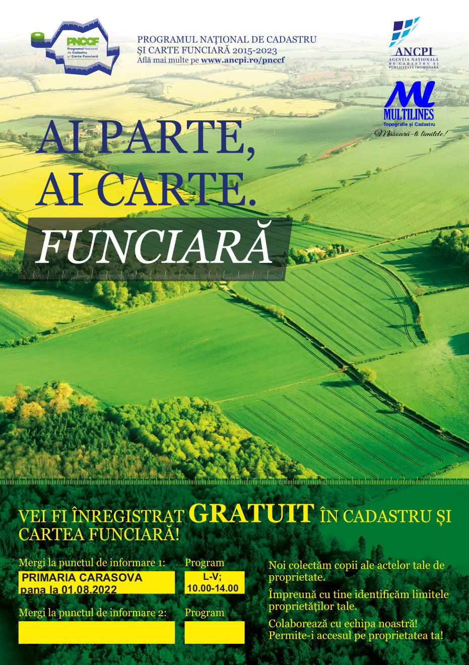 SC MULTILINES SRL, cu sediul in Timișoara str Sfinții Apostoli Petru și Pavel nr. 36, anuntă începerea serviciilor de înregistrare sistematică în sistemul integrat de cadastru și carte funciară a imobilelor situate in UAT CARASOVA, JUDETUL CARAS-SEVERIN, SECTOARELE: 31,37,10,12,24,32,57
