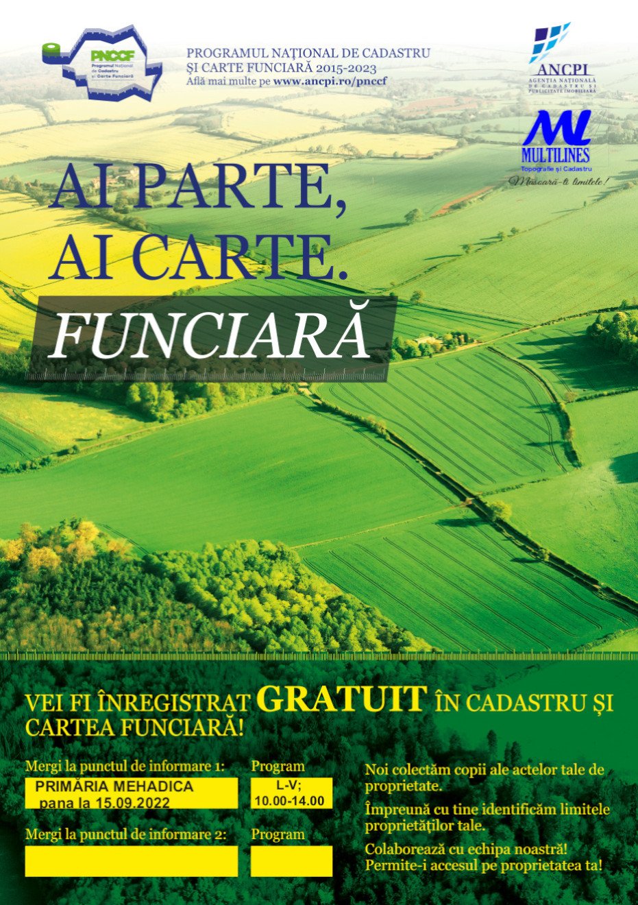 SC MULTILINES SRL, cu sediul in Timișoara str Sfinții Apostoli Petru și Pavel nr. 36, anuntă începerea serviciilor de înregistrare sistematică în sistemul integrat de cadastru și carte funciară a imobilelor situate in UAT MEHADICA, JUDETUL CARAS-SEVERIN, SECTOARELE: 12,17,31,42